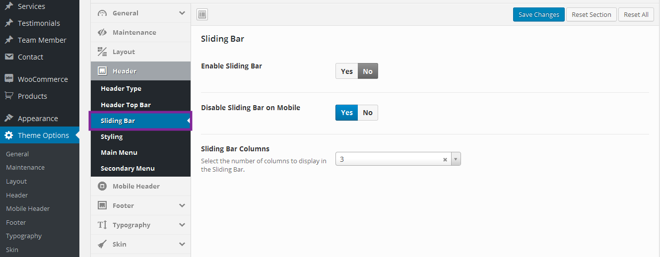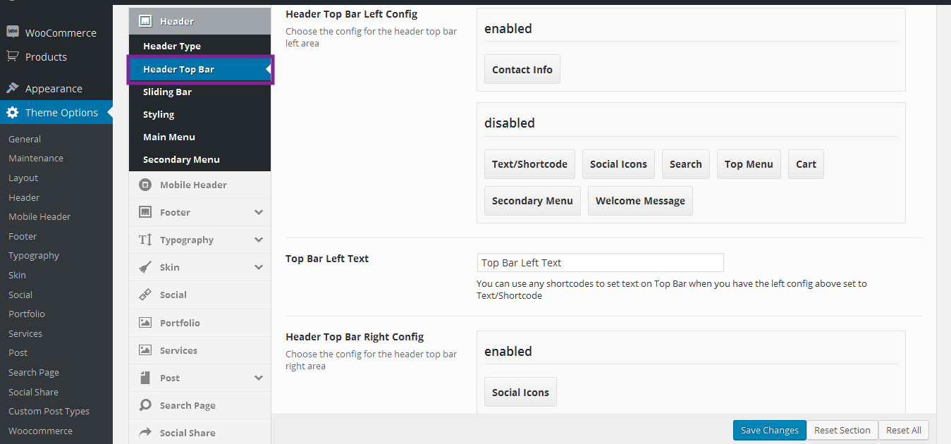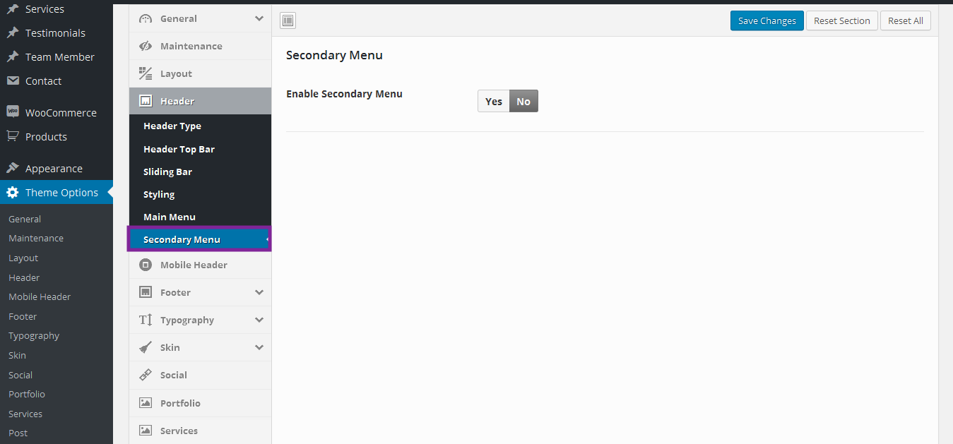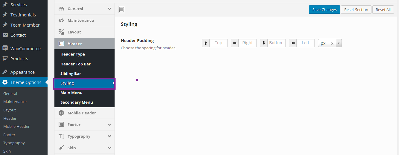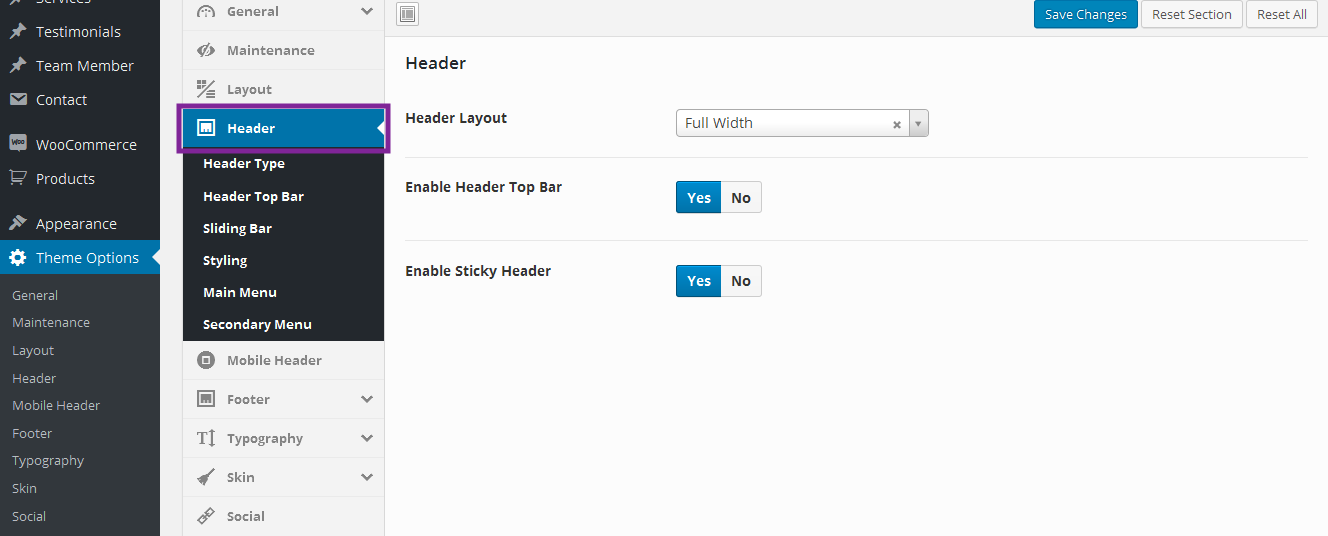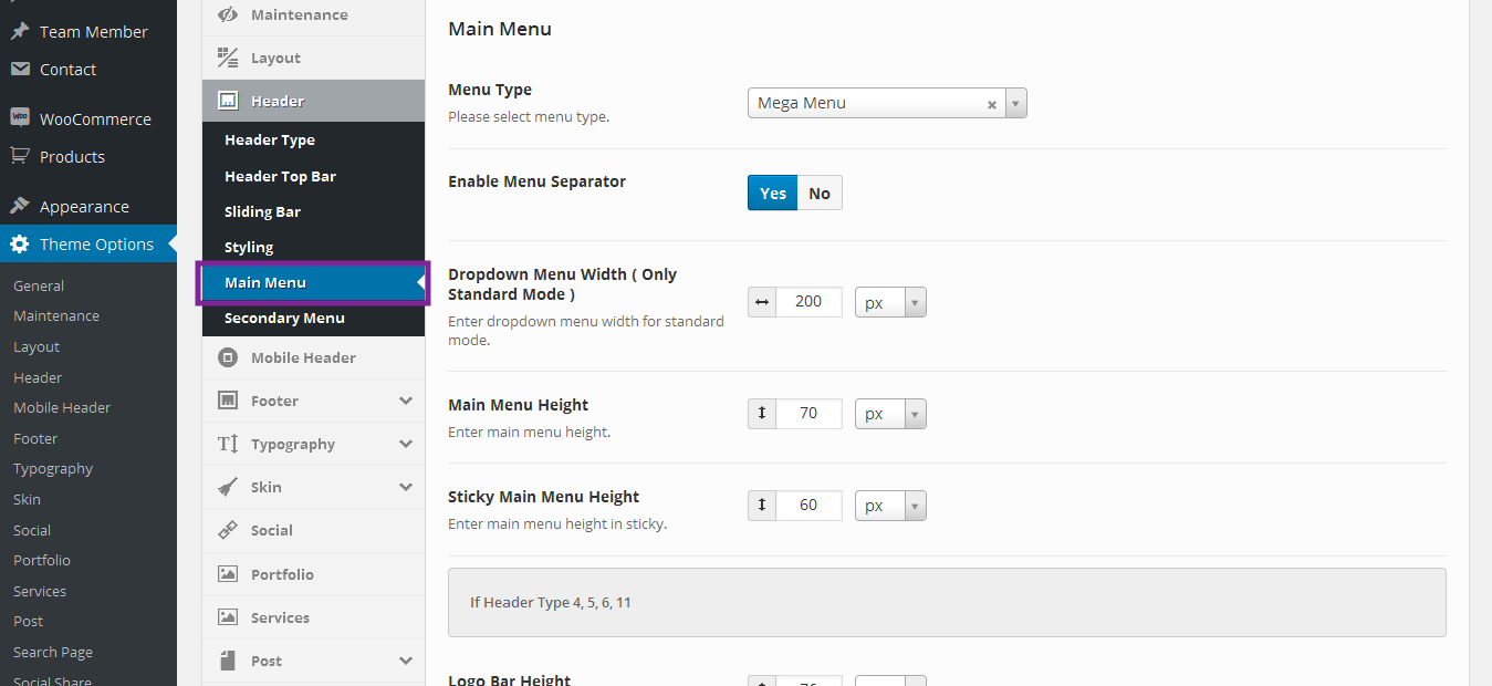 Navigate to Theme Options > Header to access the header options. You will see 5 sections; Header Type, and Header Top Bar, Sliding bar, Styling, Main Menu, Secondary Menu. See below for information and screenshot on what each section contains.