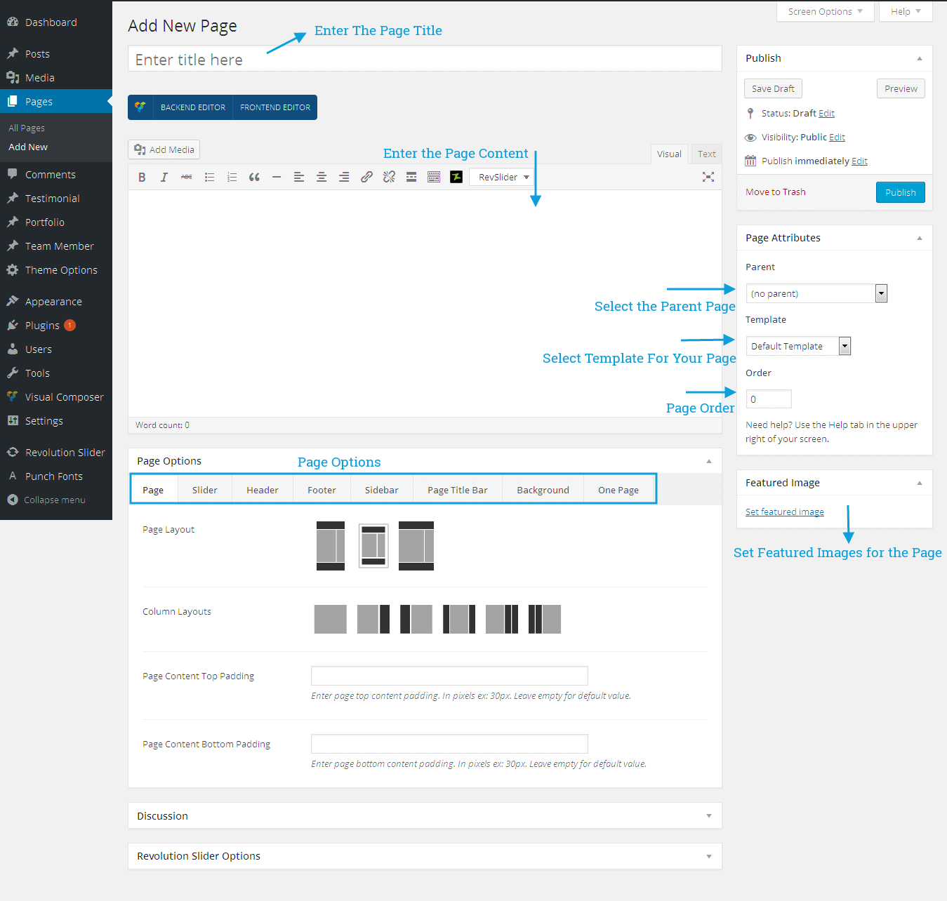 You can create pages from several page templates which is listed above. You will need to choose the page template that suits for your sites. This can be done from the page section in admin sidebar.