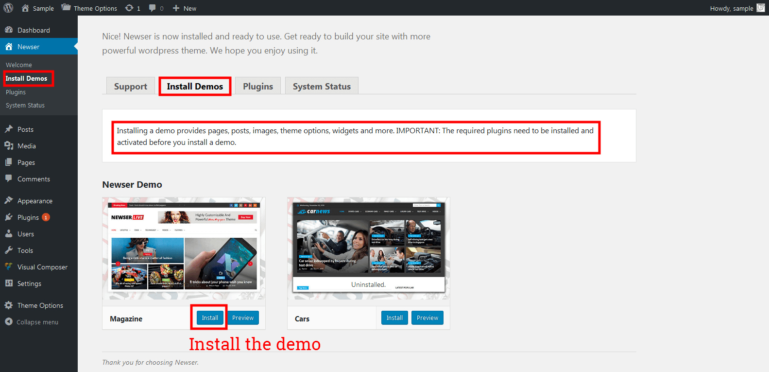 - Navigation to install demo tab. You can see the notification that IMPORTANT: The required plugins need to be installed and activated before you install a demo.