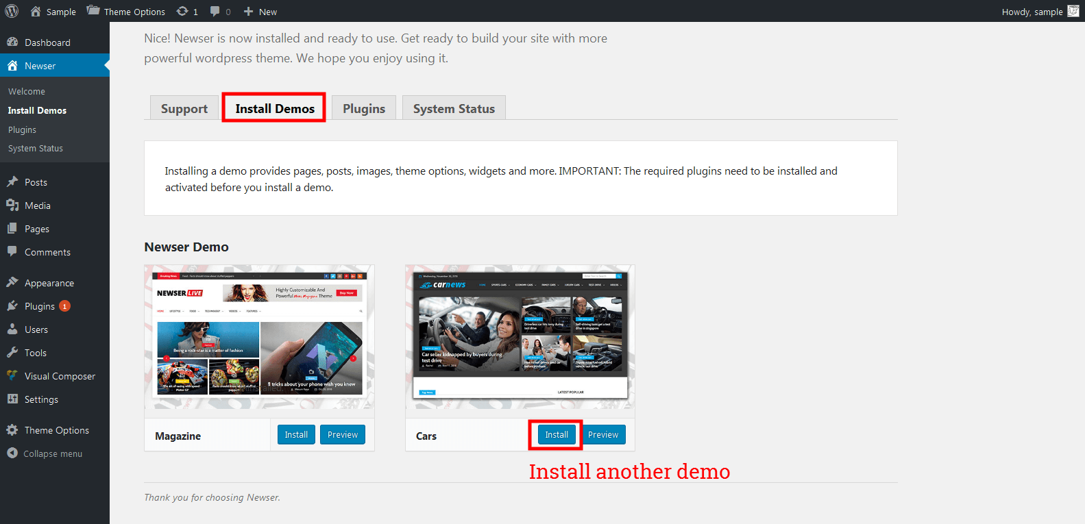 - After installed the two plugins, navigate to install demo tab