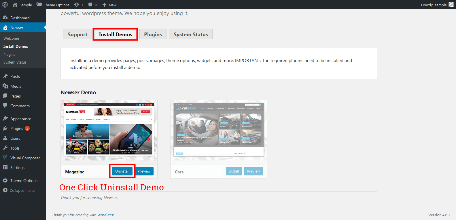 - One Click Uninstall: If you want to use another demo, you have the option to uninstall the previous installed demo and install the new demo.