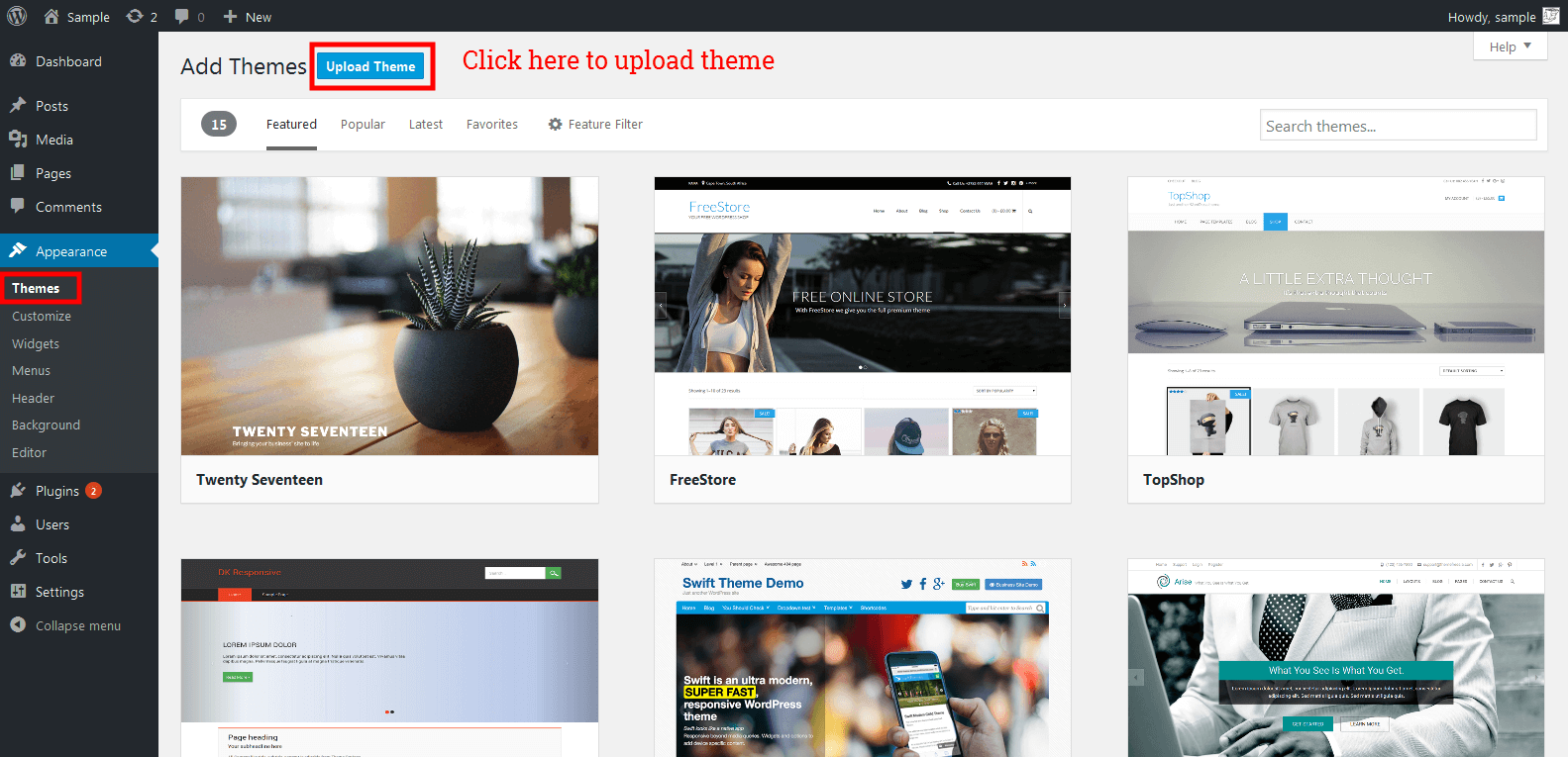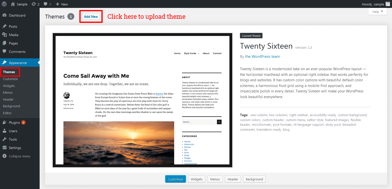 - Click on Upload Theme button at the top of the screen.